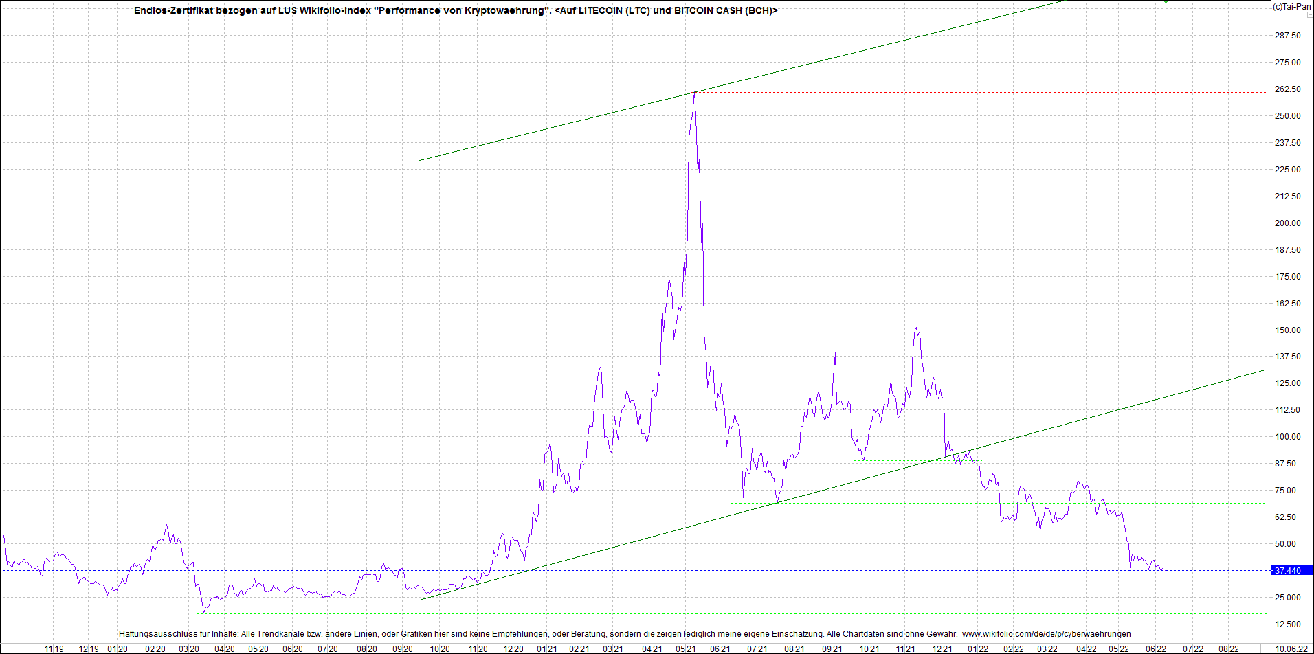Anbei das Zertifikat, bekannt als: Endlos-Zertifikat bezogen auf LUS Wikifolio-Index "Performance von Kryptowaehrung",  jetzt versorgt mit Performance von Litecoin (LTC) und von Bitcoin Cash (BCH).
