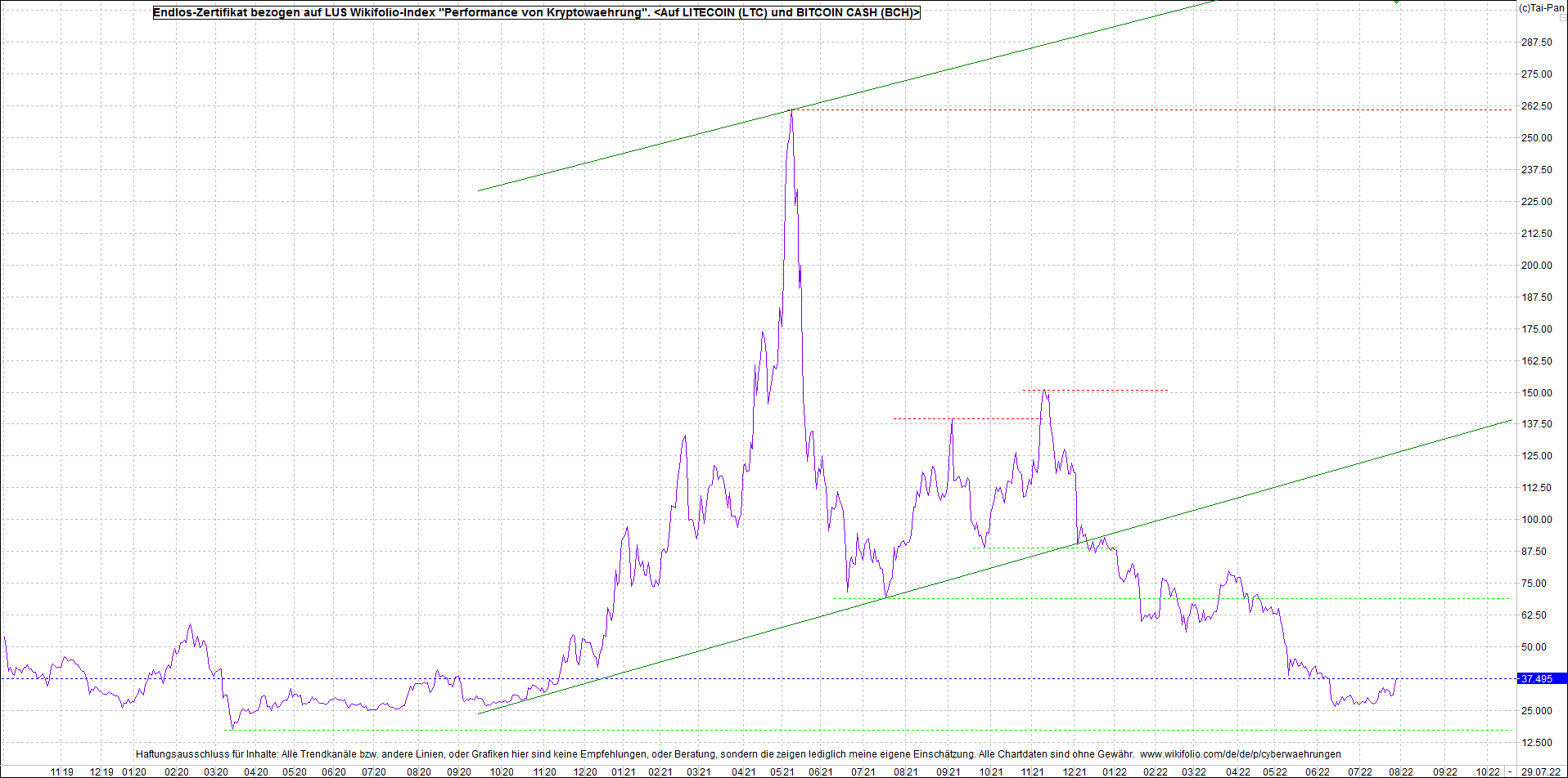 Anbei das Zertifikat, bekannt als: Endlos-Zertifikat bezogen auf LUS Wikifolio-Index "Performance von Kryptowaehrung",  jetzt versorgt mit Performance von Litecoin (LTC) und von Bitcoin Cash (BCH).