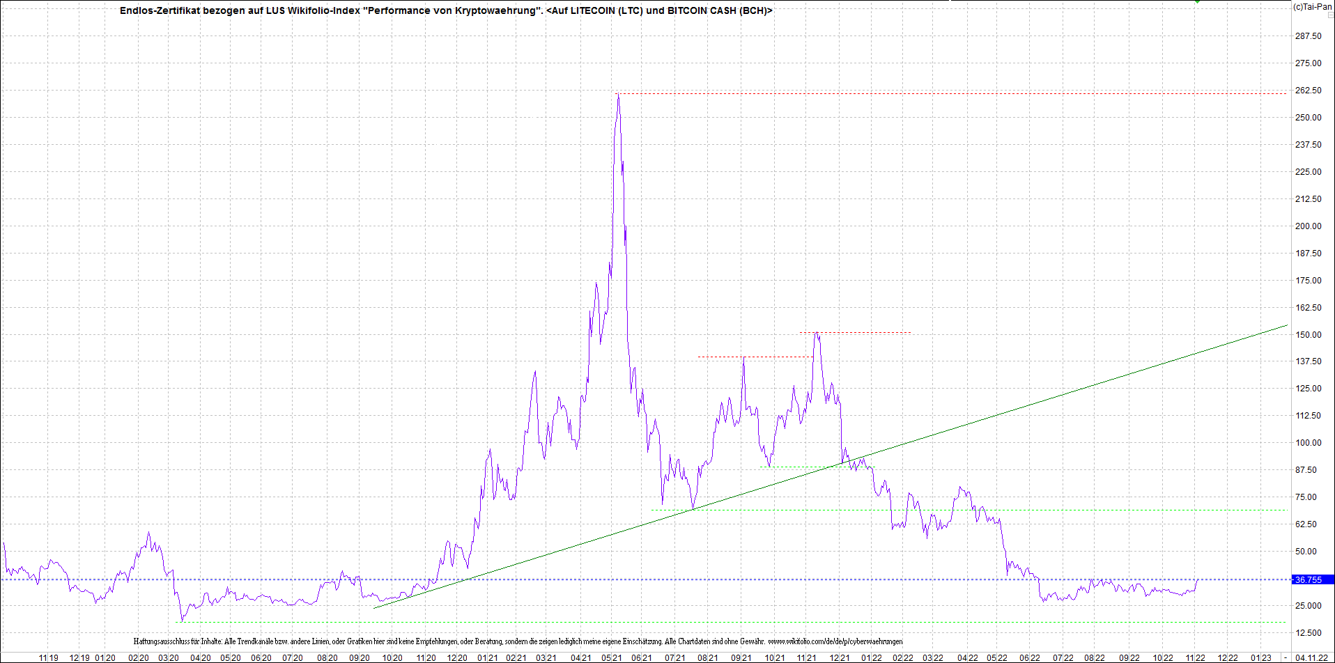 Anbei das Zertifikat, bekannt als: Endlos-Zertifikat bezogen auf LUS Wikifolio-Index "Performance von Kryptowaehrung",  jetzt versorgt mit Performance von Litecoin (LTC) und von Bitcoin Cash (BCH).