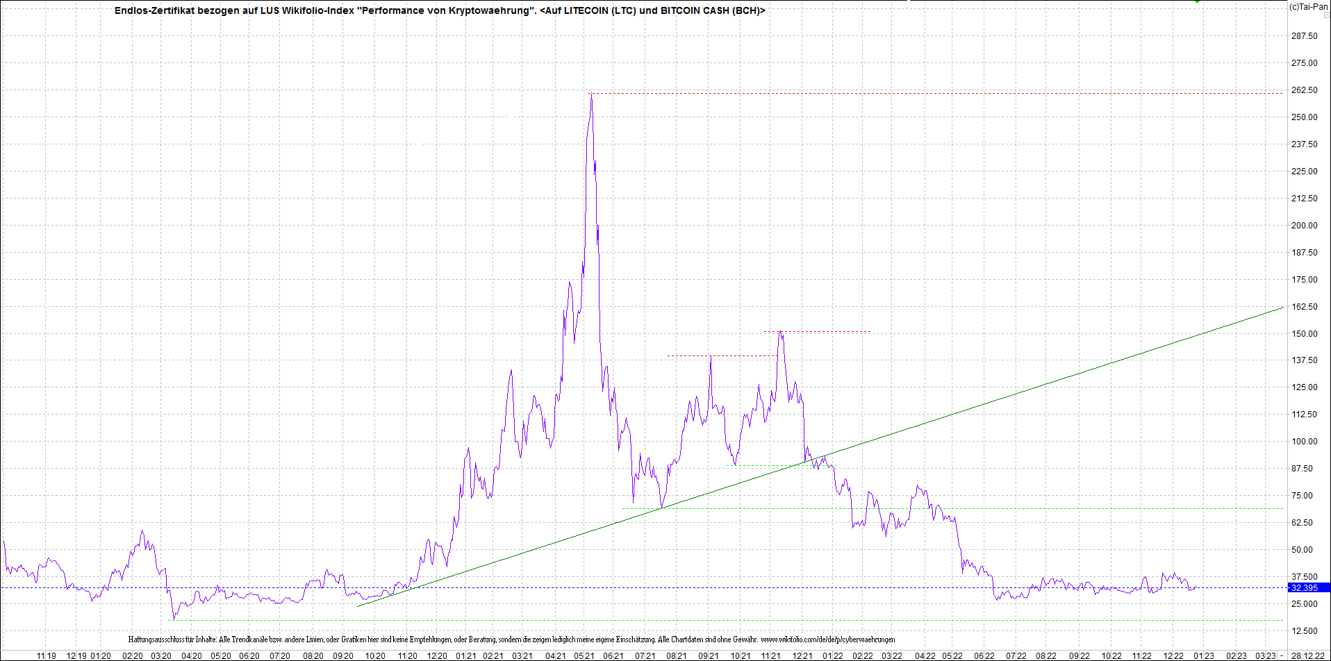 Anbei das Zertifikat, bekannt als: Endlos-Zertifikat bezogen auf LUS Wikifolio-Index "Performance von Kryptowaehrung",  jetzt versorgt mit Performance von Litecoin (LTC) und von Bitcoin Cash (BCH).