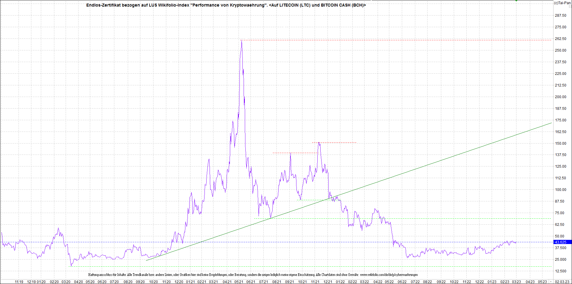 Anbei das Zertifikat, bekannt als: Endlos-Zertifikat bezogen auf LUS Wikifolio-Index "Performance von Kryptowaehrung",  jetzt versorgt mit Performance von Litecoin (LTC) und von Bitcoin Cash (BCH)...
