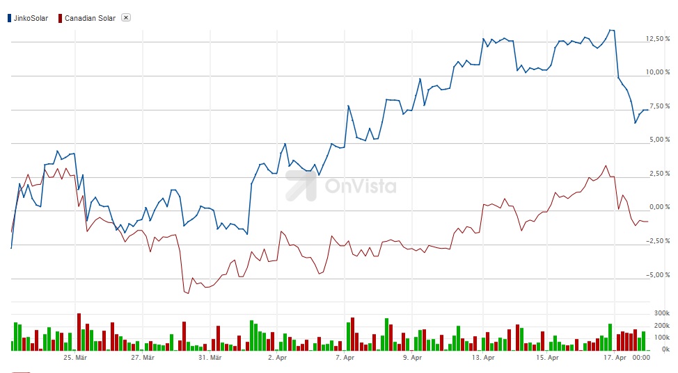 Das es nun Jinko etwas mehr erwischt hat als die anderen, lag einfach an deren besser Performance die letzten Wochen. Man muss beipsielsweise nur den Vergleich von Canadian und Jinko im Chart ziehen. Beide haben dieses jahr ähnlich gute Aussichten...aber die Ralley von Jinko war im letzten Monat klar besser. Deshalb kam es nun zu dieser reaktion, dass sie 2% mehr nach gab.