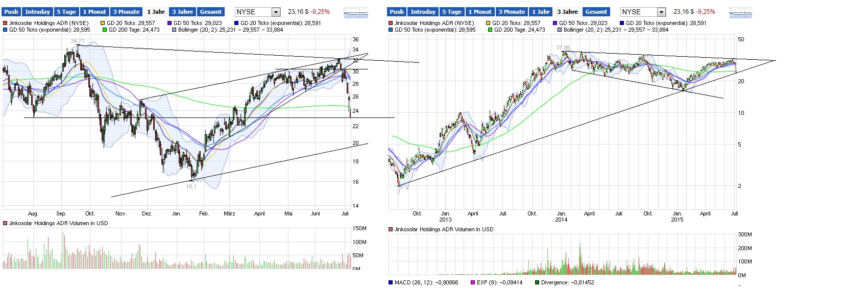 Der Kursverfall der letzten Tage ist auch charttechnisch begründet. Denn im 3-Jahreschart sieht man auch die deckelnde leicht abfallende Trendabwärtslinie ausgehend vom Hoch im Januar 2014-Hoch im Sept 2014 und dem Hoch vor zwei Wochen. Zusätzlich kam noch der Keil, den man im linken Chart sieht . Der Wurde nach unten gebrochen, dann kam es zum pullback auf die bekannte 30$ linie, was gleichzeit die 20 Tagelinie und das mBB ist. Damit wurden kurzfristig extrem viele Verkaufssingale ausgelöst.