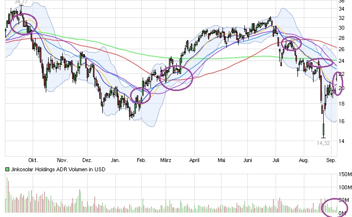 In der Tat Ulm, die 50 Tage linie ist sehr wichtig für Jinko. Mindestens gleichbedeutend ist für mich aber auch die 20er Linie und die verheißt mittlerweile ein starkes Kaufsignal. Anbei unten der Jahreschart mit Tageskerzen und viiiieeelen Durchschnittslinien.