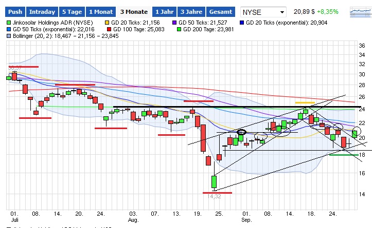 Dargesttelt unten ist der 3-Monatschart. Als Kerzen. Man sieht schon den Abwärstrend bis kurz nach den Zahlen mit tieferen Tiefs und tieferen Hochs (rote Linien) Außerdem etablierte sich um die 200 Tagelinie herum bei 24/24,50$ seite Ende Juli ein dickes Brett/Widerstand. Ende August dann der wahnsinnige Ausverkauf mit einer übelsten Übertriebenheit aber eben nun mal bedingt weil man schön viel schlechtes aus den Zahlen herauspicken konnte ("fundamental") und charttechnisch eben auch viele Verkaufssignale da waren. Den REst hat dann der GEsamtmarkt und die Leerverkäufer erledigt. Dafür konnte man nochmal billig einkaufen, wenn man wie ich nicht gerade bei 12,30 € ausgestoppt wurde knapp über der KO-Schwelle. Aber egal neuer Schein rein bei 16,50$ und Teilverkauf bei 23,80$.