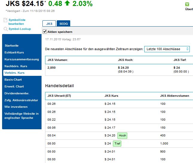 Da Jinko deutlich höhere Waferfertigungskapazitäten hat wie JA Solar oder Canadian Solar und dazu mittlerweile mehr und mehr vom hochmargigen Stromverkauf profitiert (Q3 Stromumsatz ca. 36 Mio. $ bei einer Bruttomarge von rd. 50%) dürfte das bei Jinko meiner Einschätzung nach (deutlich) besser aussehen. Sollte aber Jinko mit solch schwachen Gewinnmargen wie in Q2 daher kommen, dann heißt es sich ganz warm anziehen, denn dann wird Jinko garantiert unter 20 $ rutschen. Die Wahrscheinlichkeit für dieses Szenario halte ich aber für sehr gering, da Jinko von der Kostenseite her und von den Märkten her bestens aufgestellt ist, die Bedingungen in Q3 sehr gut waren (z.B. Yuan-Abwertung, stabile Modulpreise in China, Malaysia-Produktion voll in Betrieb, Rohstoffpreise auf sehr niedrigen Preisniveaus wie Polysilizium, Silberund Alu) und bei der Q2-Conference Call Mitte August das Jinko-Management zu Q3 wie auch zu Q4 sehr zuversichtlich war.