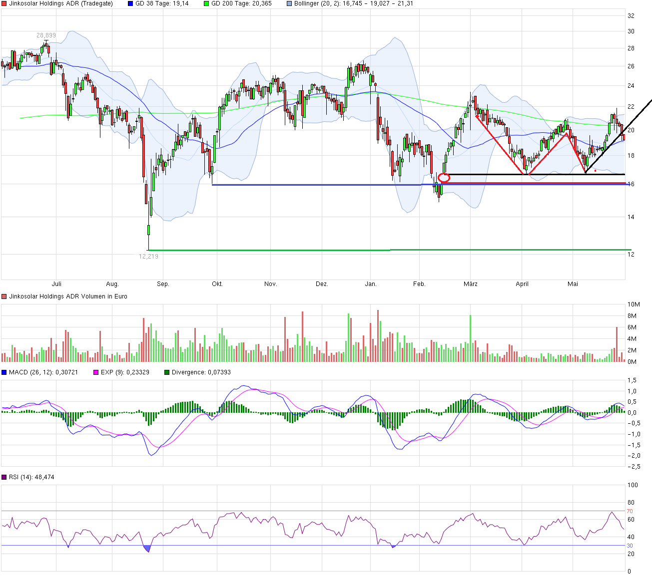 Wie wichtig die 200-Tageslinie ist weiß wohl jeder und daran ist Jinko im März gescheitert und nun auch gestern und wenn die 50er heute reißt, dann dürfte es in der Tat wieder zu den 19,50 $ gehen, denn genau hier war der Strartschuss vor 3 Wochen zur Kursrallye, die uns ja bis zu 24 $ geführt hat und danach ging dann halt der Abverkauf wieder los. So ungewöhnlich war das ja nun auch nicht gerade für Jinko.