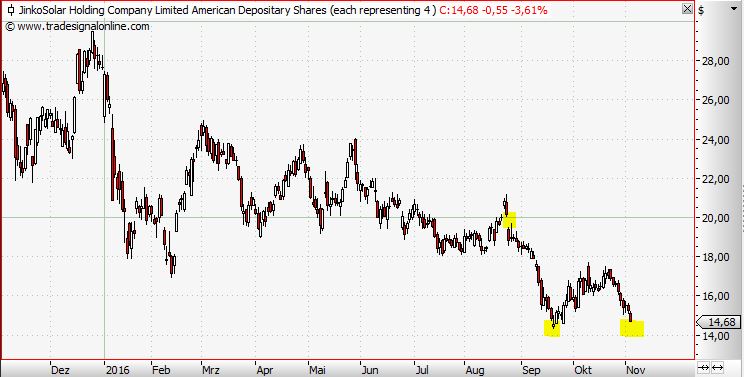 Meiner Meinung nach ist derzeit die Solarbranche wohl die schwierigste Branche überhaupt, denn eines ist schon auch klar die richtig schlechten Zahlen werden erst ab Q4 kommen und die werden sich mit ganz großer Sicherheit bis ins 1. Hj. 2017 hineinziehen. Derzeit sieht man aber auch, dass bei den Wind- wie auch Solaraktien eher das Schreckgespenst Trump gespielt wird, denn nicht nur Solaraktien haben in den letzten Tagen kräftig an Wert verloren, sondern auch eine Nordex mit gut 12% oder Vestas und Gamesa mit 10%. Die USA ist nun mal ein ganz wichtiger Markt für Wind wie auch für Solar.