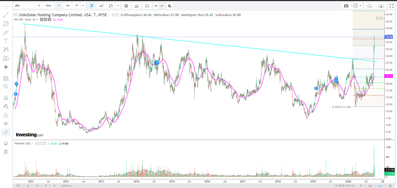 Ich möchte erstmal nichts weiter verkaufen, da stimme ich Brutho zu. Nur wo sollte man jetzt den Stopploss setzen? Es ging ja dermaßen die Post ab, dass erstmal eine Konsolidierung erfolgen MUSS, bevor es weiter hochgeht. Kann man da überhaupt sinnvolle Unterstützungslinien ausmachen? Der Aktionär empfielt 20 Euro (24.9.2020), also etwa alter 23$ Widerstand. Das ist mir etwas zu tief.
