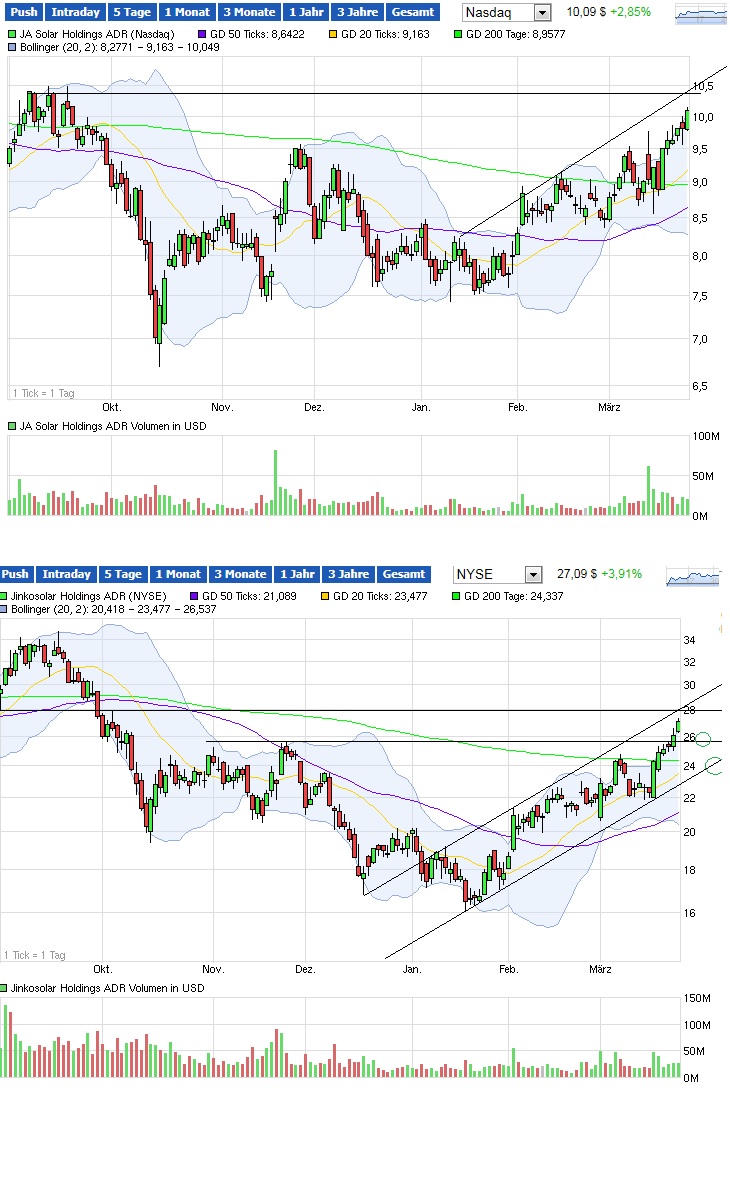 Nicht allzu positiv sind die News der großen taiwanesischen Hersteller, denn die senken ihre Zellpreise weiter (Tiefstpreis mittlerweile bei nur noch 0,28 $/W) und ihre Auslastungsquote ist von 80 bis 90% auf nur noch 60 bis 70% gesunken. Das kann man aber mit den China-Solaris nicht vergleichen. Jinko hat ja ihre Produktion in Q1 voll ausgelastet (jedoch spielen hier natürlich die Feiertage/Urlaubstage im Februar in China zum Neujahrsfest ein große Rolle) und die Q2-Produktion war ja schon zu Anfang März zu 60% durch die gute Auftragslage verkauft.