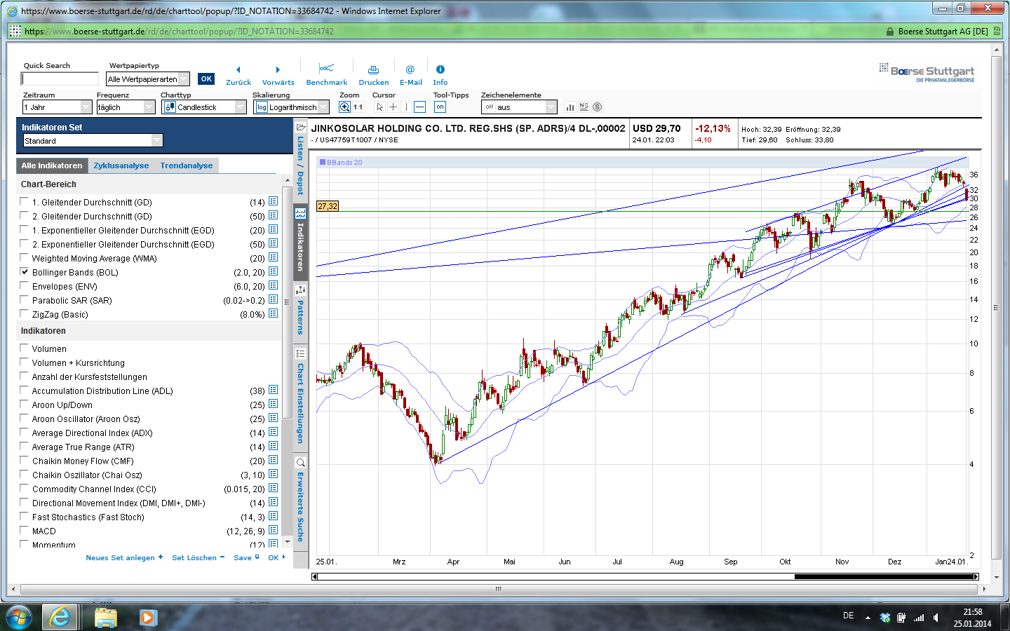 Einstieg sehe ich in dem Fall erst wieder bei 26,70-27 $ (ja dollar, nicht euro, so traurig es auch klingen mag) wo die wichtigen Wiederstände, gleitende Durchschnitts etc zusammentreffen. Auch wenn das Bondinger Band bei 28,5$ liegt, denke ich dass die anderen Indikatoren hier überwiegen werden.
