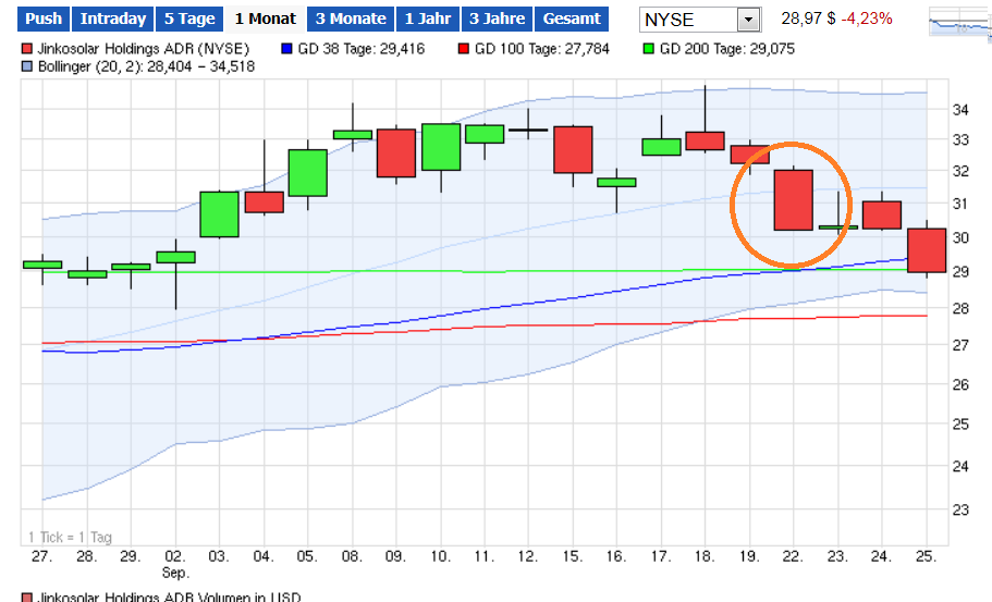 "solange wir in der oberen hälfte des Bollinger Bandes sind" -> am 19. haben wir dieses mit einer großen roten Kerze nach unten durchstoßen, damit fällt das andere Szenario mit Ziel 36$ erstmal flach. Außerdem lag der Schlusskurs an jenem Tag nicht über 34$.