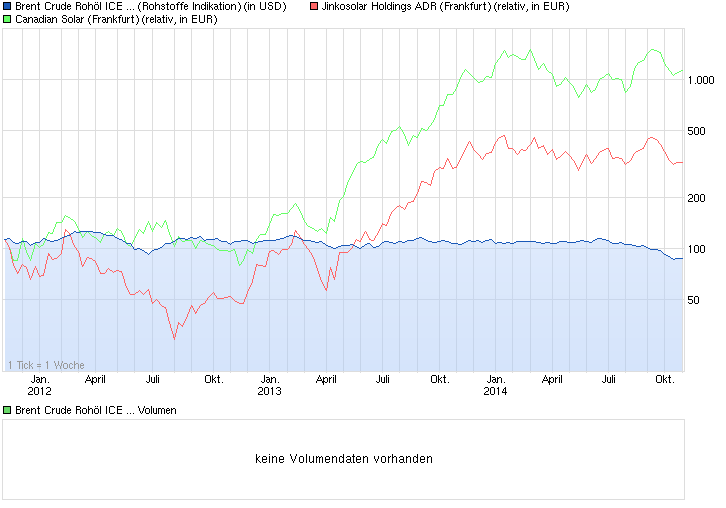 Graphik: Grün Canadian, rot Jinko, blau Öl Auf 3-Jahressicht ist insgesamt der Ölpreis gefallen und Jinko und Canadian ca. 350 bzw. gut 1000% gestiegen. Genau das gleiche im 1-Jahreschart oder 3-Monatschart: Ölpreis gesunken und Solaris gestiegen.