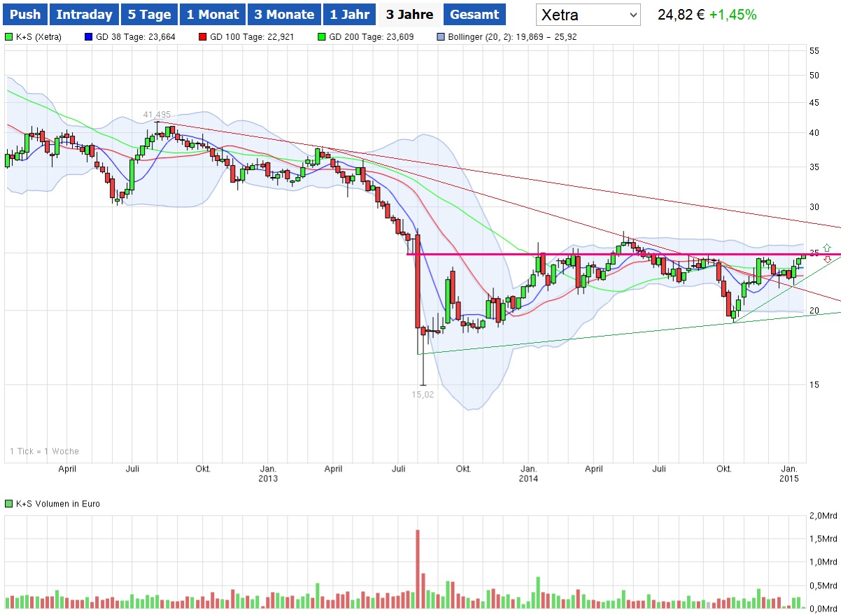Es wäre nun schön zu sehen, wenn unsere K+S-Aktie die 25 EUR-Marke nach oben hin nachhaltig knackt, dann können wieder alte Kursstände (Range zwischen 26 und 30 EUR) wahrgenommen werden.