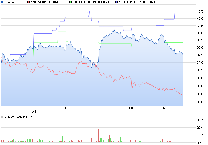 "Die US-Bank JPMorgan hat die Einstufung für K+S auf "Overweight" mit einem Kursziel von 38 Euro belassen. Der Salz- und Düngerhersteller dürfte 2015 einen Gewinn von 2,81 Euro je Aktie erreichen, was Anlegern eine Dividende von 1,20 Euro je Anteilsschein bescheren sollte, schrieb Analyst Martin Evans in einer Branchenstudie vom Montag. Die Kaliumsulfat-Preise dürften auch 2015 und 2016 als Treiber fungieren...."