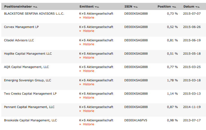 Brookside Capital Management, LLCBoston, MA Mitteilung von Netto-LeerverkaufspositionenZu folgendem Emittenten wird vom oben genannten Positionsinhaber eine Netto-Leerverkaufsposition gehalten: K+S Aktiengesellschaft ISIN: DE000KSAG888 Datum der Position: 15.01.2014 Prozentsatz des ausgegebenen Aktienkapitals: 0,49 % muss man etwas tiefer graben. Danach hat es zu denen zur Aktie keine neue Meldung gegeben. |