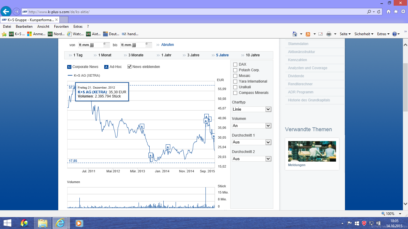 Haben Sie sich auch überlegt, warum das Management die rd. 30 Kleinstanleger angeschrieben hat; nachdem er vorher suggeriert hat, dass K+S deutlich mehr Wert ist als 41,00 . Darüber sollten Sie sich auch einmal Gedanken machen.