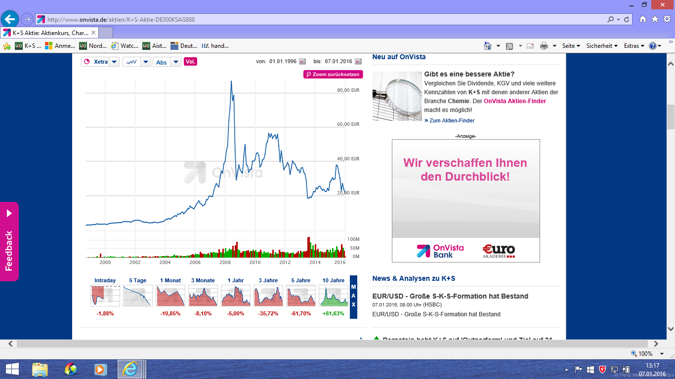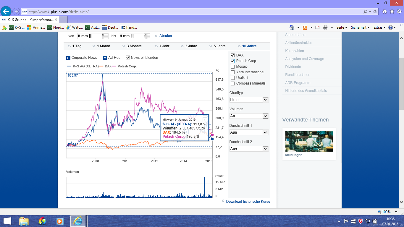 Ich denke 10 Jahre in der Börsenwelt sind eine lange Phase. Schauen wir also gemeinsam auf die Performance von DAX, K+S und Potash (Quelle: K+S Homepage) und stellen fest: