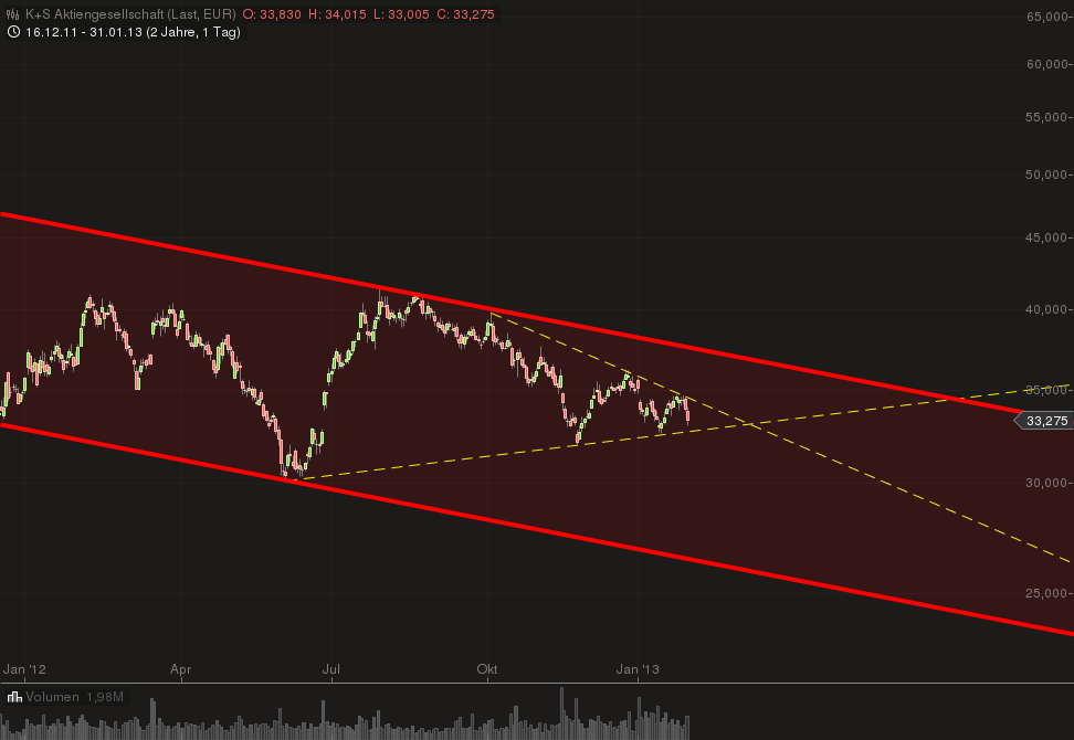 ...jetzt sind erst mal die Bären am Zug. Inverse SKS und W- Umkehrformation nach unten aufgelöst. Fällt die 33, gehts zügig Richtung 30. Fällt die 30 ist Potential bis 20. Aber auch nur wenn die 30 fällt. Entscheidend werden die Gewinne sein. Auch wenn die 30 fallen sollte, aber der Reingewinn 3,30/Aktie erreichen sollte, geht der Fahrstuhl mit Schwung wieder hoch. Ich vertraue dem Unternehmen. Die Nachfrageschwäche bei Kali wird nicht bis zum jüngsten Tag anhalten. Bill Doyle von Potash sieht auch nicht schwarz für 2013: Für das laufende Jahr rechnet Konzernchef Bill Doyle aber mit einer Erholung des Pottasche-Marktes. Dazu dürfte auch die jüngste Einigung in China über neue Verträge beitragen. Verzögerungen dort hatten am Markt für Zurückhaltung gesorgt. 2013 dürfte der Gewinn auf 2,75 bis 3,25 Dollar je Aktie klettern. Für das erste Quartal stellte Doyle 0,50 bis 0,65 Dollar je Aktie in Aussicht. Am Markt werden derzeit 69 Cent erwartet (http://www.finanznachrichten.de/nachrichten-2013-01/25850794-k-s-konkurrent-potash-verfehlt-gesenkte-ziele-2012-knapp-016.htm). Und wie ich schon sagte. Ich kann warten und ggf. schön billig nachkaufen.