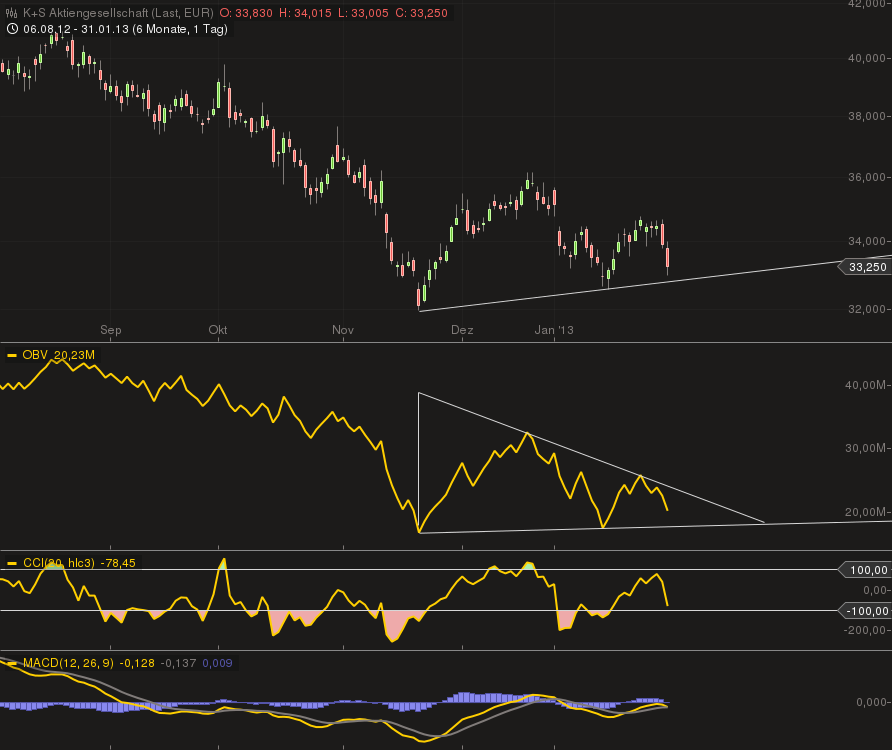 Das OBV Signal bildet kurzfristig gesehen steigendes Dreieck...es ist nach meiner Meinung eher wahrscheinlicher, dass der Kurs unten nach oben abprallt und weiter steigt...und vergesst die übergeordnete inverse SKS Formation nicht...insofern ist alles in Ordnung...kritisch wird es, wenn es unter 32,80 fällt...