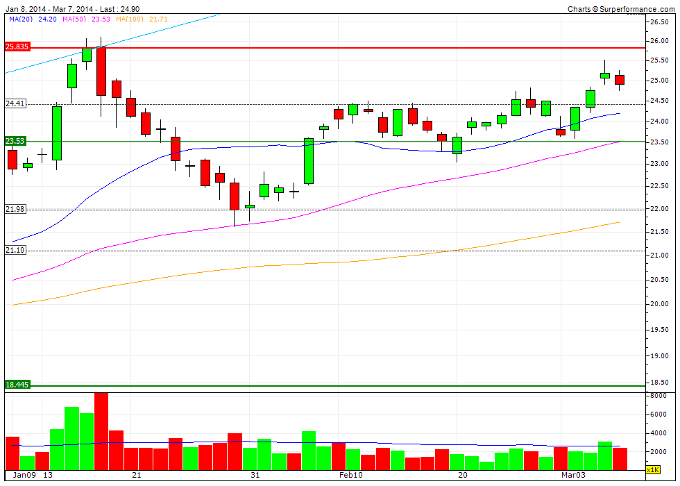Our system’s recommendation today is to STAY IN CASH. The previous SELL recommendation was issued on 03.03.2014, 4 days ago, when the stock price was 23,7950. Since then SDF.DE has risen by +4,64%.