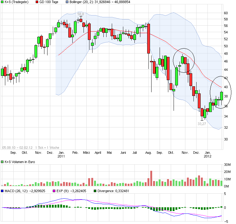 Nun ist er da der strenge Winter – endlich (!) werden Kali und Salz Aktionäre sagen. Denn die bislang zu milden Tage und durchwachsenen Nachrichten aus der Branche wollten die Aktienkurs des Salz- und Düngemittelherstellers einfach nicht steigen lassen. Zumindest das Wetter hat sich nun deutlich geändert. Der strenge Wintereinbruch in Osteuropa und natürlich auch hierzulande lässt Anlegerherzen wieder etwas höher schlagen. Ob dies gerechtfertigt ist wird sich zeigen müssen. Gestern hat die Aktie nun endlich ein Kaufsignal generiert indem sie über 38,- Euro angestiegen ist. Bei 39,- Euro war dann aber schon wieder Schluss. Das kurzfristige Ziel liegt nun bei bei 41,60 Euro, etwas über dem Hoch vom November 2012. Diese muss unbedingt überwunden werde, da ansonsten jederzeit die Gefahr eines Rücksetzers unter 38,- Euro droht. Die K+S Aktie befindet sich auch nach dem gestrigen Anstieg immer noch in einem seit Anfang August 2011 gültigem Abwärtstrend. Für eine nachhaltige Aufhellung dieses Chartbildes müssen die Bullen nun als noch eine ordentliche Schippe drauflegen.