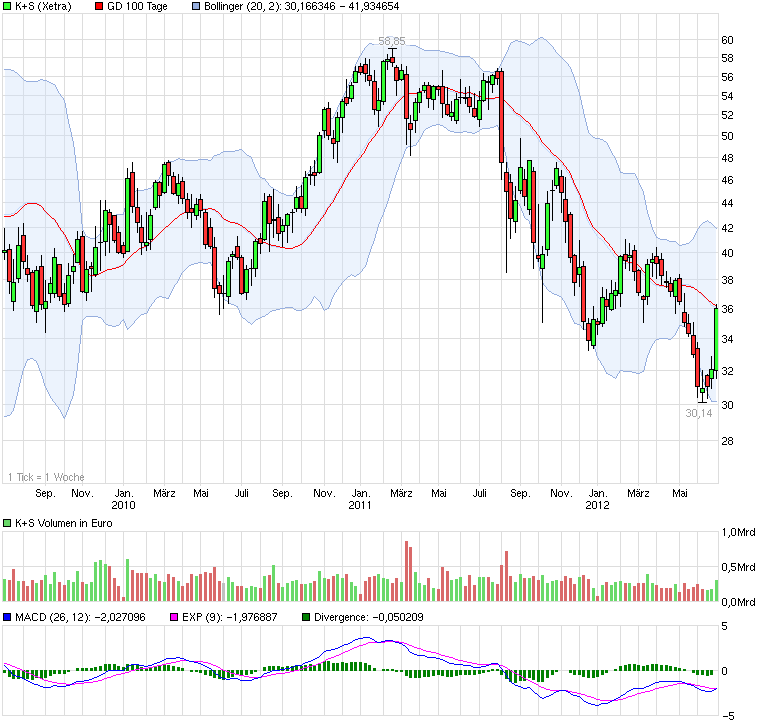 DER AKTIONÄR sieht bei der K+S-Aktie nach der schwachen Kursentwicklung der vergangenen Wochen ein Potenzial von 30 Prozent. Mit einem 2012er-KGV von 11 ist die Aktie sehr günstig. Im Schnitt waren die Anleger in den vergangen zehn Jahren dazu bereit, das 15-Fache des Gewinns zu zahlen.