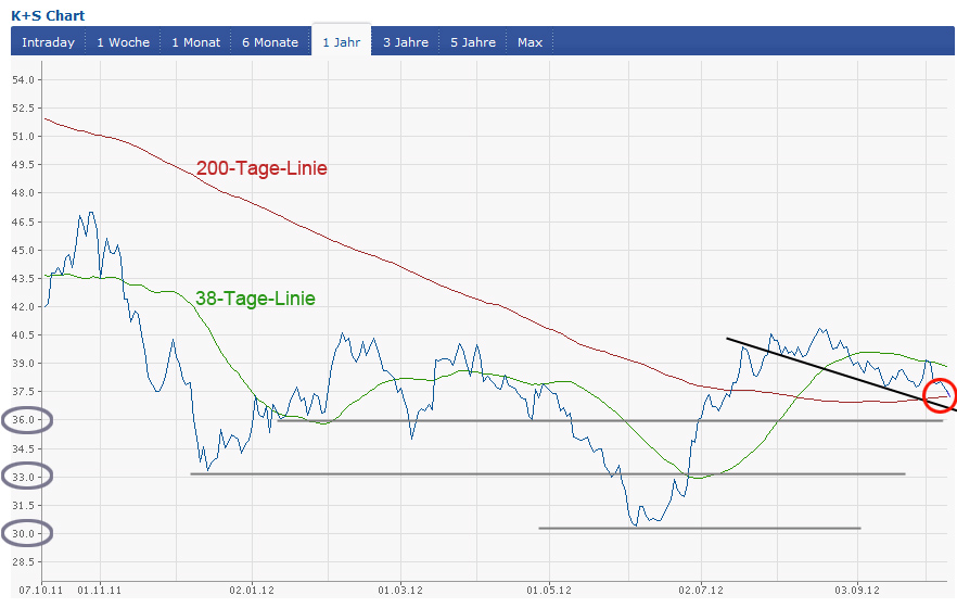 . bei Durchbruch der 200-Tage-Linie (ca. 37,40 €) = Verkaufssignal