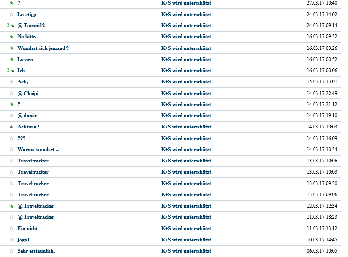 Damit habe ich ganz grob das allergrößte Problem der K+S beschrieben. Diese Problematik wird über die Fortführung des Unternehmens entscheidend sein. Diesbezüglich ist keine Lösung in Sichtweite. Bisherige Versuchsanstellungen können als gescheitert angesehen werden. Es sieht nicht gut aus. Die Stimmung bei den mit dem Unternehmen verwachsenen Mitarbeitern, das schließt auch die Mitarbeiter der Pförtnereien mit ein, ist am Boden. Noch schlimmer ist es im Werk Neuhof-Ellers, da soll öfters die Förderung stehen, weil von unter Tage kein verwertbares Material gefördert werden kann. BETHGE war es egal, STEINER auch, der sah sein Heil dann in Kanada; und LOHR bekommt es mit lieb gucken und süß lächeln auch nicht in den Griff. 30 Jahre totales Managementversagen, kann LOHR nun auch nicht mehr korrigieren, dazu fehlen dem die Gene einer Wildsau.