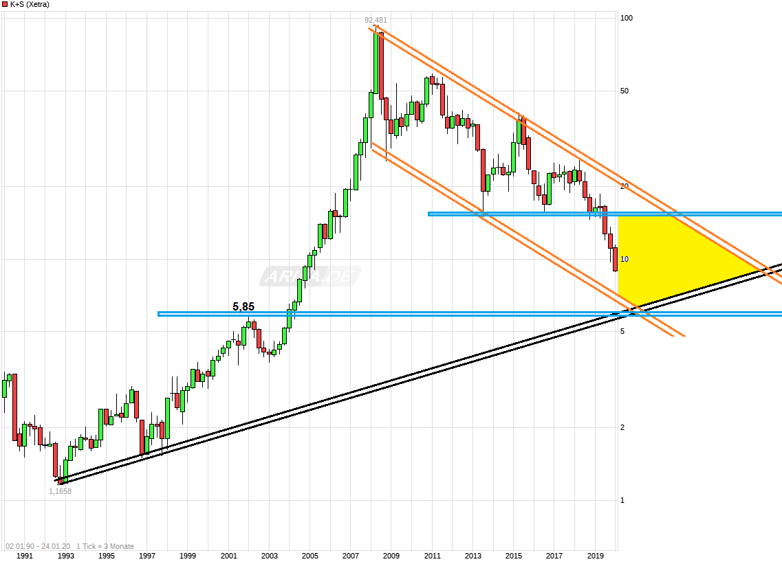 Ob es so hart kommt bleibt abzuwarten und wird einfach jetzt stark davon abhängen wie die Kalipreise sich in den nächsten Monaten entwickeln werden und ob hier Übernahmegelüste anderer Player nochmal auftauchen werden. Die weiterhin hohe/steigende Leerverkaufquote ( shortsell.nl/short/KS/all/archived ) zeigt ja, daß man hier offenbar noch ein gutes Stück weiteren Südkurs bei der Aktie von Seiten der LV erwartet. Vielleicht spekulieren die ja auch auf einen extremen Rücklauf an den langfristigen Aufw.trend. Würde wohl dann Kurse in tiefer 6er Regionen bedeuten, wenn es so käme. Angesichts der großen Strecke die man schon gefallen ist in den letzten Jahren, wäre diese restliche Reise bei Kursen von z.Z. schon knapp unter 9€ auch keine Riesenstrecke mehr. Von daher halte ich Kurse mit einer 6 vor dem Komma durchaus für möglich, wenn sich die Preissituation für die Produkte nicht wieder bald stabilsiert/verbessert und vielleicht sogar noch weiter verschlechtert. Die Mega-Verschuldung von K+S ist einfach in so einer Situation eine echte Bleikugel. Da war das Management der letzten Jahre einfach zu blauäugig was die künftige Preisentwicklung der Produkte und den Kapazitätausbau der Wettbewerber betrifft. Muß man einfach nun beobachten und sich nicht zu statisch darin verbeißen, daß so tiefe Kurse wirklich kommen werden. Sollten sich wichtige Faktoren vorzeitig wieder ändern, dann könnte man auch wieder die Longseite spielen. Einfach gedanklich flexibel bleiben. Angesichts der hohen Schwankungsbreite der Düngerpreise über die Jahre, ist diese Aktie eben mehr ein temporäres Trade-Vehikel für Long/Short Positionen und weniger eine wirklich vertrauenserweckendes Langfrist-Investment. Betrifft aber im Prinzip alle Firmen die Rohstoffproduzenten sind und kann man eben nicht mit "normalen" Industriewerten vergleichen bzw. haben derartige Firmen wenig Korrelation mit der Gesamtbörse.