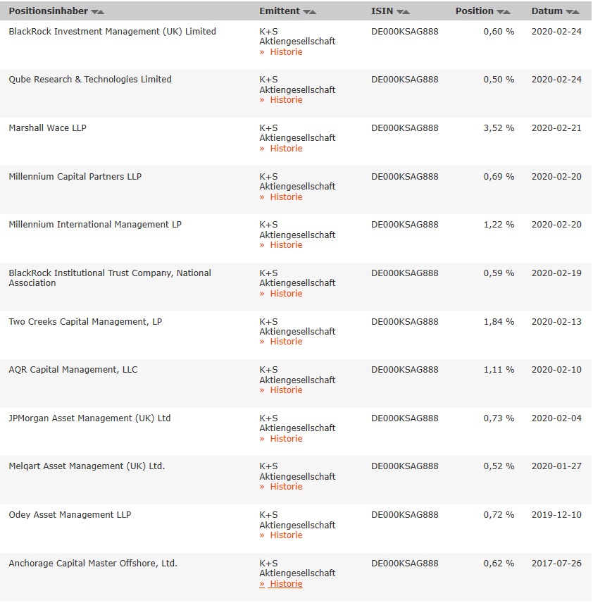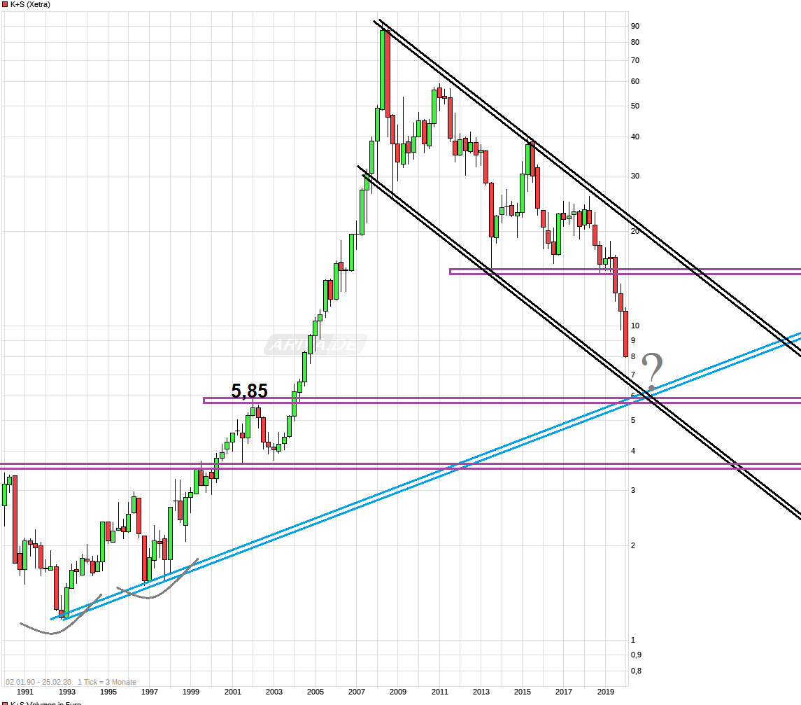 Also wenn man seit vielen Jahren schon in einer klaren Abwärtsbewegung steckt, man wieder das nächste 15 Jahrestief macht und auch in den Monaten vor Corona bereits verstärkt schon nach unten durchgereicht wurde während der Markt neue Allzeithochs machte, dann sollte natürlich klar sein, daß diese Kursentwicklung doch unabhängig von Corona abläuft und lediglich weiter die gleichen Gründe den Kurs nach unten treiben wie seit vielen Monaten leider schon. Da sollte man sich also nicht in die Tasche lügen und versuchen nun Dingen übermäßig Schuld zu geben die außerhalb dessen liegen was das Management zu verantworten hat. Das K+S sich in der ungünstigen Situation mit dem monströsen Schuldenberg befindet ist zu großen Teilen klar vom Management zu verantworten und das Management hat bislang faktisch noch nichts auf die Beine gestellt um es zu ändern. Hier wurde über viele Jahre völlig blauäugig Milliarden ausgegeben und riesige Schulden gemacht in der Annahme die Welt wird ab jetzt für immer nurnoch Schön-Wetter-Bedingungen haben und keine Konkurrenten werden je auf die Idee kommen ebenfalls die Kapazitäten deutlich auszubauen und damit ein großes Überangebot zu schaffen. Grenznaive Manager haben jedoch stets einen golden Fallschirm für sich selber. Der Dumme ist wie immer bei Minderleister-Vorständen nur der einfache Aktionär. Mit bislang nur dünnen Lippenbekenntnissen zu eventuellen Tafelsilberverkäufen ohne echte Taten ( 11.12.2019 Salz- und Düngerhersteller muss kämpfen Schuldenberg und Marktschwäche - K+S unter Druck www.manager-magazin.de/unternehmen/...er-druck-a-1300819.html ) beeindruckt man weder die normalen Marktteilnehmer, noch die weiter hoch positionierten Leerverkäufer ( => K+S: Leerverkäufer Blackrock Investment verdoppelt Short-Position – Aktie rutscht immer weiter ab - Februar 24, 2020 - www.kapitalmarktexperten.de/2020/02/...oppelt-short-position/ ). Man muß also befürchten, daß der seit Jahren laufende Kursverfall sich weiter fortsetzt in Richtung des langfristigen Aufwärtstrends. Das würde also auch noch Kurse unter 7€ bedeuten.