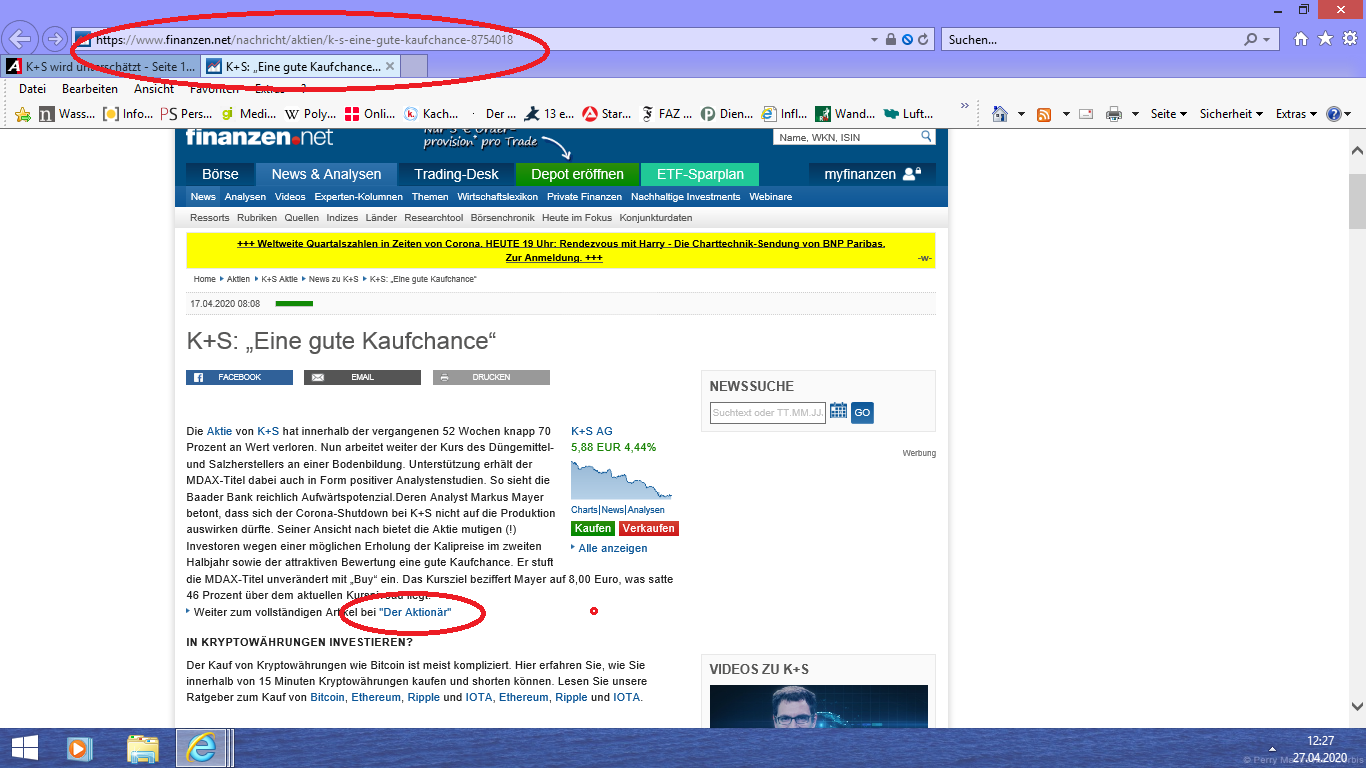 Die die in K+S rein wollten sind alle drin und fürchterlich verhauen worden und ich sehe keinen Grund bei Kursen jenseits der 4,50 nochmal aufzustocken, wo es aktuell viel bessere Chancen gibt anzulegen. Beim Corona Tief an der Börse war K+S bei 8 € und da hat der Markt im Schnitt 25 % zugelegt und K+S ist noch mal um 30 % abgerauscht. Da fehlen am Ende 44 %. Vergesst den Scheissladen einfach. Geht zur Domina, da werdet ihr auch das Geld los.
