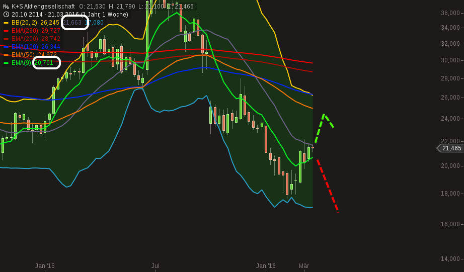 Auf Wochensicht ist nun mBB bei 21,66 Widerstand, an dem der Kurs mehrfach abgeprallt ist. Darüber zum Wochenschluss dürfte es sehr schnell auf die EMA50 bei 25 gehen.