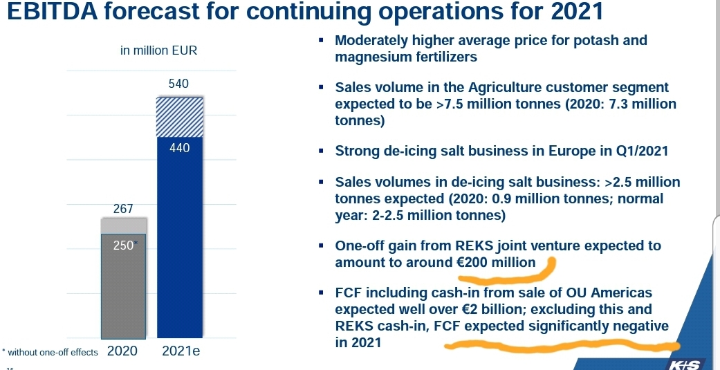 Unabhängig davon, wird das Unternehmens-FCF insgesamt natürlich sehr positiv sein, da in den - 350, das Salzgeschäft aus Q1, die 90 Mio von REKS und die 2,5 Mrd. für Americas nicht drin sind. Das betrachtet man aber normalerweise auch nicht, da nur das "continuing operations" auch in der Zukunft da ist.