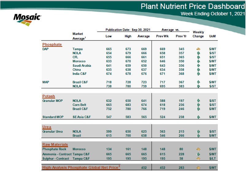 The move by China earlier this week to ban phosphate exports until at least June of next year puts even more pressure on global phosphate trade. Fertilizer prices are already significantly higher than a year ago and supplies continue to tighten. Higher natural gas prices only add to the pressure.