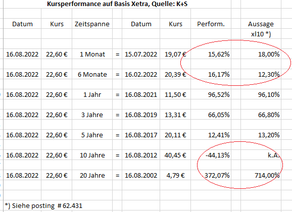 Voraussetzung für die pseudo Steigerungsrate z.B. im 5-Jahres-Vergleich von 12,41 % war, dass der Kurs zwischen dem 16.08.2012 und dem 16.08.2017 um 50,30 % gefallen ist.