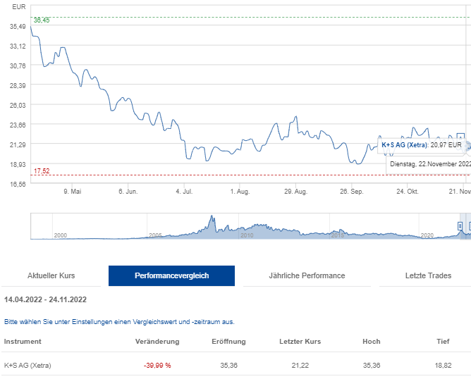 Habe ich das jetzt richtig verstanden, wenn ich K+S langfristig betrachte, bin ich ein hoffnungsloser Fall; suche ich mir aber in den letzten Wochen einen besonders niedrigen Kurs aus, um zu zeigen, dass K+S so was von gestiegen ist, zwei Euro hatten Sie ja wohl gepostet, dann habe ich alles richtig gemacht. Ist es das was Sie uns hier verkaufen wolllen.