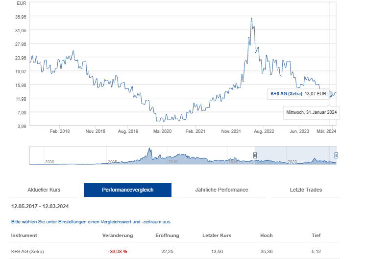 Schaut man sich den Kursverlauf (Quelle K+s) einmal an, fällt es schwer die Euphorie von freidenker oder long… zu teilen: