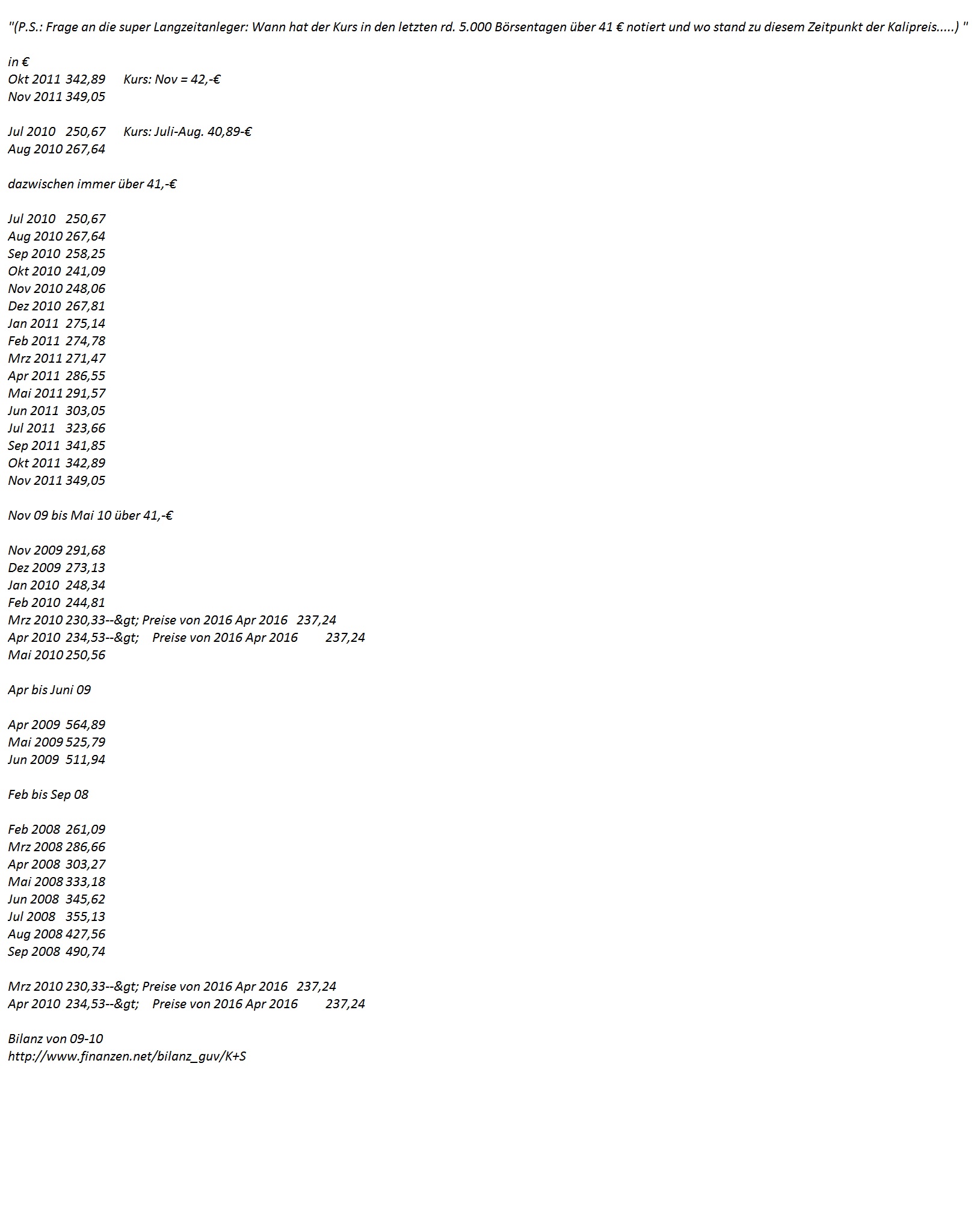 @doc: ich glaube, dass es keinen sinn macht und völlige zeitverschwendung ist, dir das zu erklären. dafür, dass k+s einen relativ starken anteil belegschaftsaktionäre hat (der bei niedriger präsenz noch stärker ist) und instis meist eh alles abnicken, war der denkzettel von der neutralen seite her schon ziemlich heftig. und nächstes jahr dürfte er noch deutlicher ausfallen, falls sich der kurs nicht bessert und weiterhin nicht mal den buchwert erreicht.