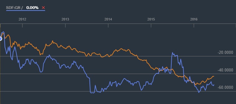 Aber nur soviel: Wenn man deinen Chart sich ansieht und die Kalikrise 2013 und die Übernahmespekulation 2015 rausrechnet erstaunt mich der Gleichlauf. Faszinierend.