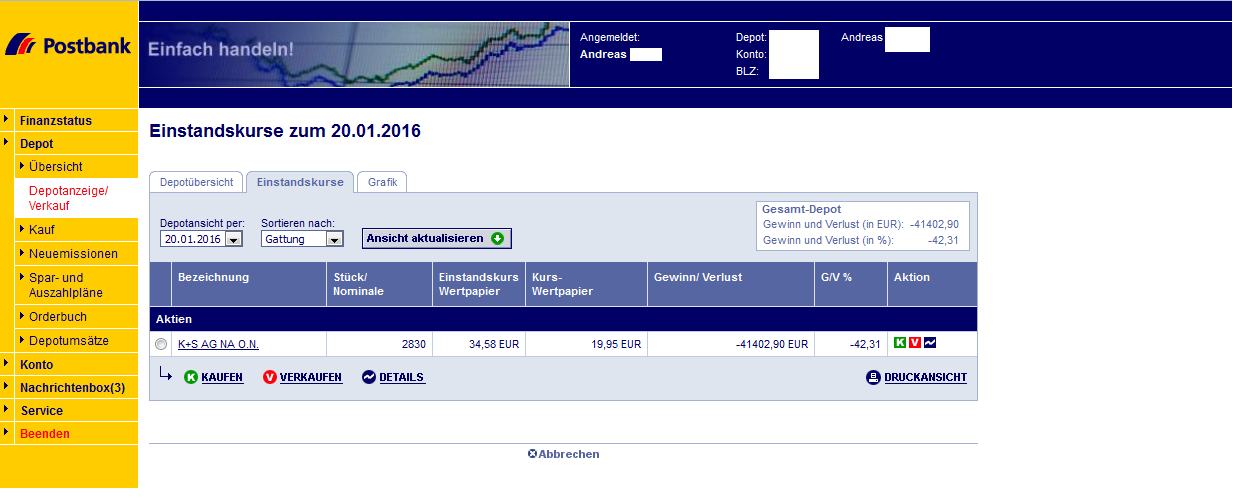 .. lange genug um zu wissen das die Börse keine Einbahnstrasse ist. Den letzten Börseneinbruch 2008/9 habe ich noch gut in Erinnerung. In der letzten Zeit konnte ich mit Nachkäufen meine Kurse deutlich drücken und wieder ins grün befördern. Dann habe ich natürlich verkauft um wieder Kapital für eventuelle weitere Kursrückgänge zu haben. So konnte ich auch Zwischengewinne einstreichen, die ich heute meinen Verlust gegen rechnen kann. Leider stehe ich nun mit meinen Depots im Minus und muss bei K+S abwarten bis wir wieder in ruhigen Gewässer schwimmen! Ich denke es geht "vielen" zur Zeit so und du, Zappelphillip? Bist du nur Zuschauer an der Börse oder hast die vielleicht eine Glaskugel, die dir alles voraussagt!