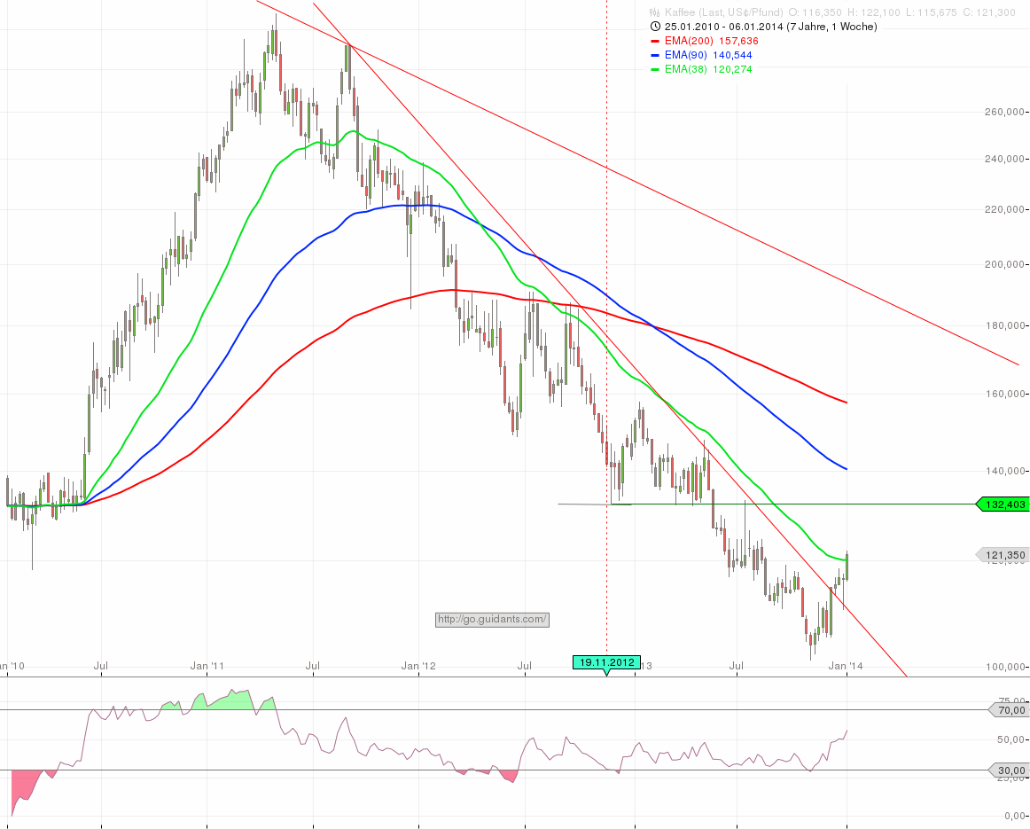 Langfristig gesehen bzw. In einem Woche Chart betrachtet dürften erst mal 130-132 Cents drin sein, das Tief Nov.2012. Mit gewissen Schwankungen könnte durchaus auch die ( 90TL Blau) bei 140 Cents erreicht werden.