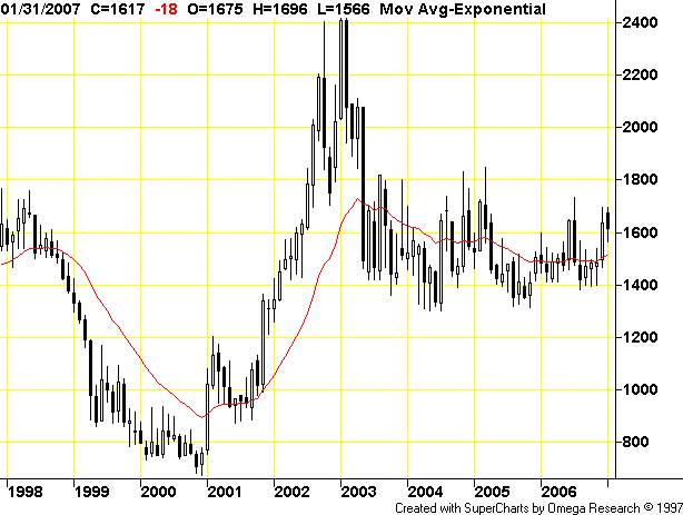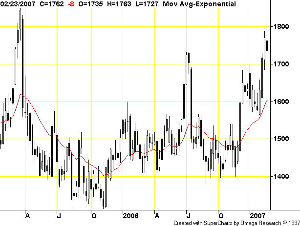 Rückblick: Der Future auf Kakao (CC) im Endloskontrakt wurde ausgehend von dem Bewegungshoch aus 2003 massivst abverkauft. Als Konsequenz daraus entstand ein Korrekturtief bei 1300,00 US-Dollar. In den Folgejahren konnte der Future in diesem Bereich einen belastbaren charttechnischen Boden ausbilden. Bereits im Jahr 2005 löste sich der Future deutlich von diesem Unterstützungsbereich. Im Zuge der einsetzenden Kurserholungsphase konnte ein Bewegungshoch bei 1738,00 US-Dollar markiert werden. Ausgehend von diesem Bewegungshoch wurde der Future, im Zuge eines Belastungstest, erneut in Richtung der maßgeblich entscheidenden Unterstützung gedrückt und bildete schließlich bei 1410,00 US-Dollar ein bullisch zu interpretierendes "höheres Hoch" aus. In den letzten Handelswochen wird eine weitere Unterstützung bei 1600,00 US-Dollar bullisch "abgeklopft". Das Kursgeschehen der letzten Wochen läßt sich demzufolge als obligatorische Pullbackbewegung eingliedern. Die Fortsetzung der Aufwärtsbewegung in den letzten Handelswochen stützt diese Aussage.