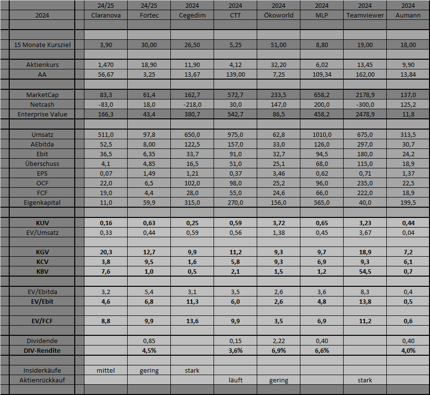 In der Tabelle habe ich nicht Aktien wie MBB oder IAC berücksichtigt, da nicht anhand üblicher Kennzahlen zu analysieren. Die relativ neu im Portfolio befindlichen Aktien von All For One und 7C Solar werde ich noch später ergänzen.