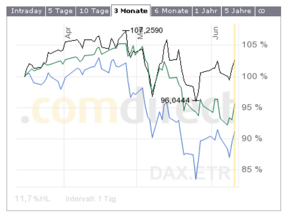 Charttechnisch gesehen sieht der Dax zudem auch bullish aus (vor allem nach der heutigen Bewegung zum Auftakt), auch wenn die Indikatoren ein wenig dagegen sprechen. Auf der anderen Seite sehen die US-Märkte eher bearish aus, was an der Underperformence gegenüber dem Dax der letzten Wochen liegt (sicherlich zum Teil auf die Euroschwäche zurückzuführen). Die US-Märkte liegen allesamt unter der 200TL mit fallender 38TL und mittelfristig bearishen Indikatoren. In den USA ist die Situation jedenfalls sehr spannend. Da muss es aus meiner Sicht im Juni die Entscheidung geben, ob wir im Sommer steigende oder zumindest seitwärts gehende Kurse sehen, oder ob wir nen typisches "sell in may"-Jahr sehen. Wenn der Dow über 10400 geht, bin ich für Aktien im allgemeinen bullish. Bleibt man unter 10300 und die 38er kreuzt noch bearish die 200er, dann kann man wohl von fallenden Kursen ausgehen, vielleicht sogar bis knapp 9100 im Dow. Rein fundamental würde ich allerdings dann wieder mit Hinblick aufs Jahresende zum Aufbau von Aktienpositionen raten.