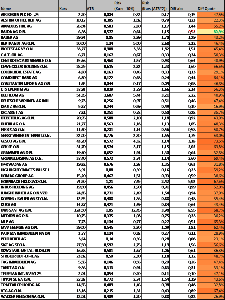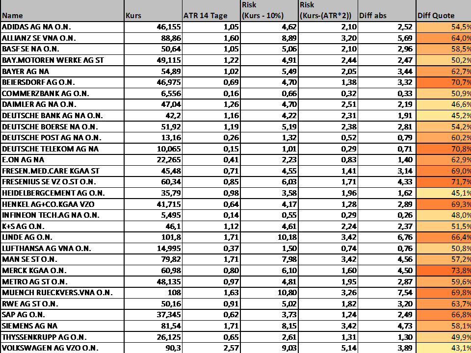 Ich habe mal spaßeshalber auf Basis der heutigen Xetra-Schlusskurse die Stop loss-Kurse für die DAX-Werte mit der "10%-Regel" (SL = Kurs - 10%) und des doppelten ATR (SL = Kurs - (ATR 14 Tage*2) ermittelt.