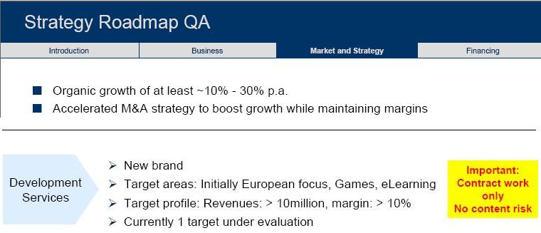 "Die Übernahme von Kuju stellt einen Meilenstein in der Diversifikationsstrategie und der Ausweitung des Dienstleistungsangebotes für die digitale Medienindustrie dar. Entscheidend ist insbesondere, dass Kuju als Teil der Catalis ausschließlich reine Auftragsproduktion machen wird und sich somit ausschließlich als Dienstleister versteht. Hier unterscheidet sich Kuju etwas von zum Beispiel der in Deutschland notierten 10tacle AG, die ebenfalls Spiele programmiert, aber stärker am kommerziellen Erfolg der entwickelten Spiele partizipiert. Catalis sind nunmehr künftig auch im Markt für Spieleprogramme und Spieledienstleistungen stark vertreten", sage Hasenstab den Experten im Hintergrundgespräch. Damit habe das Unternehmen die Kritik seitens der Investoren weggefegt, die stets bemängelt hätten, dass Catalis zu klein sei was den Umsatz betreffe und zu wenig im Geschäft diversifiziert sei.