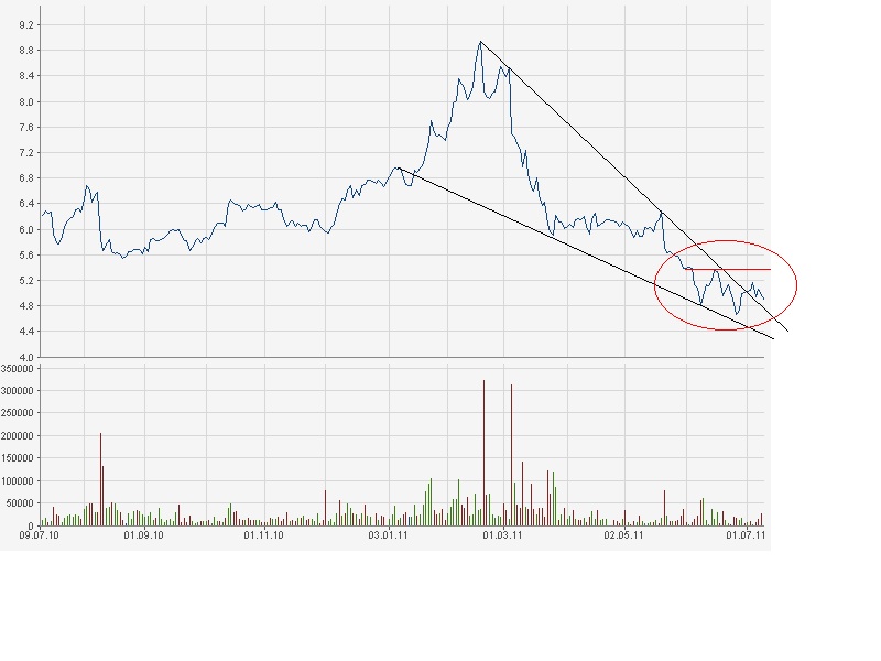 Für mich sieht es so aus, als würde sich nun eine Schulter-Kopf-Schulter bilden, wobei die Nackenlinie etwa bei 5,40 liegt.