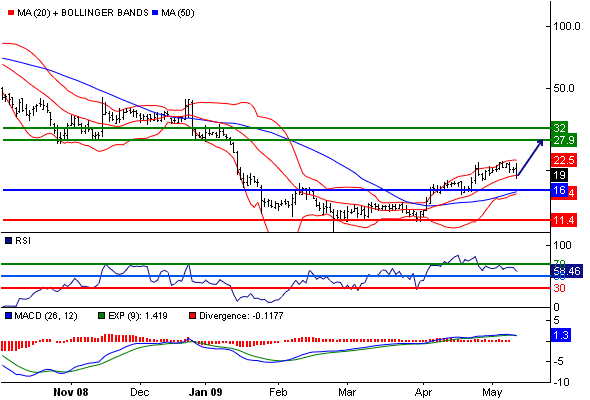 08.05.2009 - Eine deutliche Aufwärtsbewegung hat die Continental-Aktie in den vergangenen Wochen verzeichnet. Zuvor bildete sich oberhalb der 10-Euro-Marke ein mögliche Boden. Von 11,35/11,37 Euro aus kam es dann zu einer klaren Erholungsbewegung, die in den vergangenen Tagen im Bereich der Zone um 22 Euro auf Widerstand traf. Am 27. April kam es zu einem ersten Anstieg in diesen Bereich mit einem sich anschließenden Rückschlag auf 18,04 Euro. Gestern dann wurde die 22 Euro punktgenau im Tageshoch erreicht – und wieder kam es zu einem Rückschlag. Die Continental-Aktie ging mit 21,09 Euro aus dem Handel.