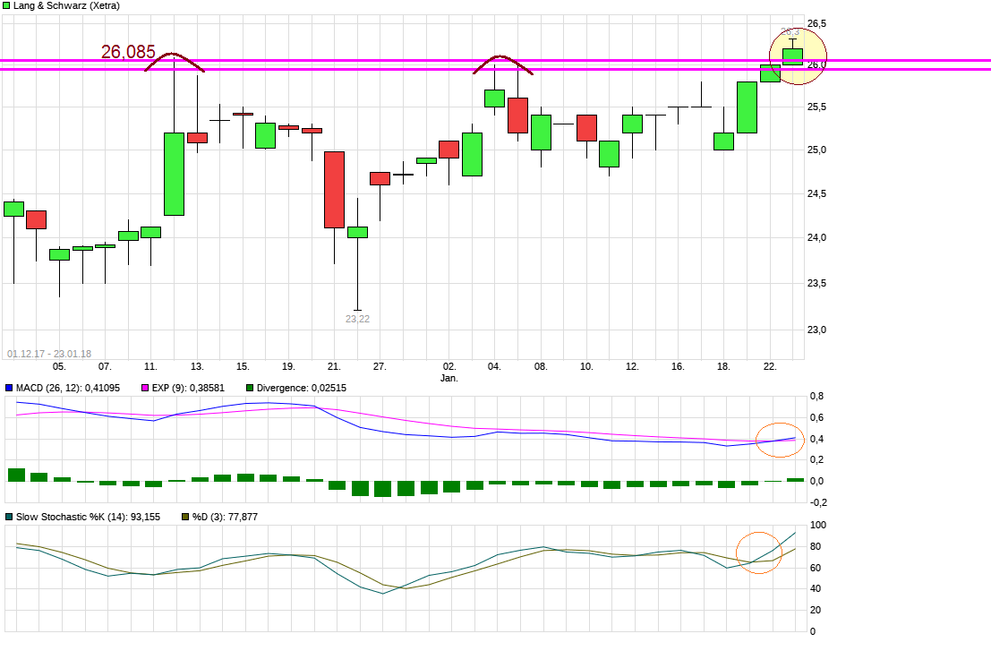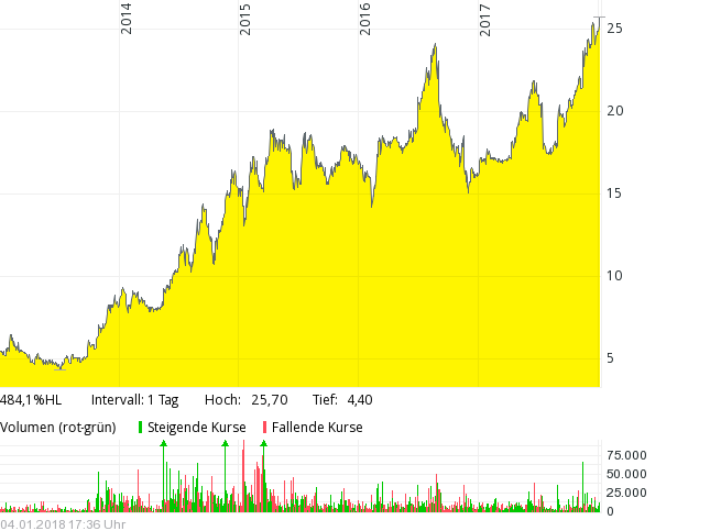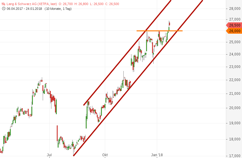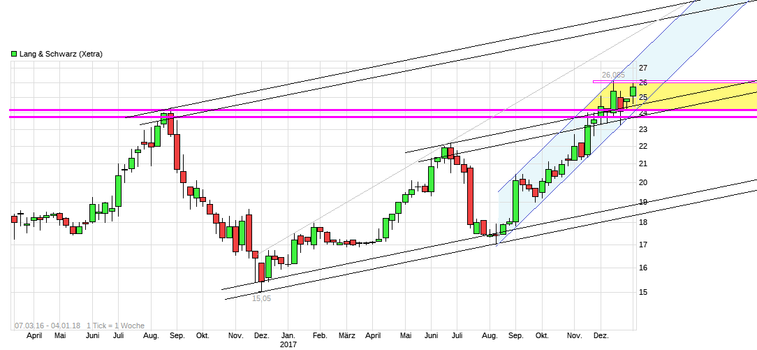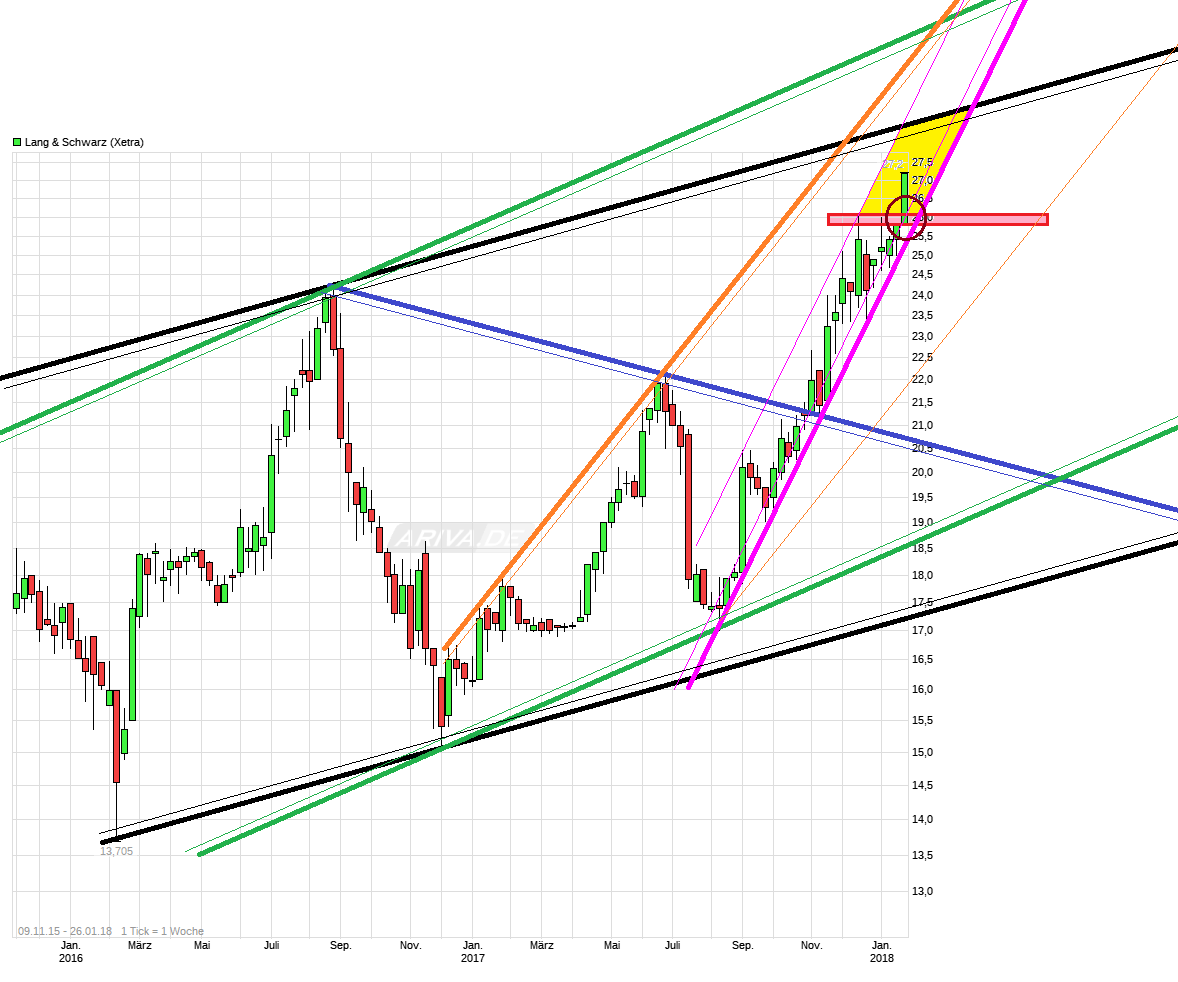 Und lediglich eine Drei vorne könnte auch bedeuten 3,xx €. Sorry, kleiner Spaß :) Also ich würde auch gerne die 3x,xx € sehen und hoffe es geht noch etwas weiter in diese Richtung nach überwinden der Region 26,00/26,10. Ich nehme aber was kommt, solange es positiv ist für die Depotposition und ziehe meinen SL dynamisch nach. LuS hatte immer wieder Phasen wo es recht steil nach oben geht und dann auch wieder welche wo es dann auch mal wieder recht steil runtergeht. Da fahre ich lieber mit "Airbag". Muß man jetzt mal schauen, ob man lieber etwas moderater "schwarz" oder etwas offensiver "grün" kanalmäßig spielen wird, ob sich eine weitere Variante entwickelt und was überhaupt an neuen Zahlen & Prognosen von der Firma ausgegeben wird. Mit steigenden Kursen im Vorfeld dieser Zahlen steigen ja dann auch die Gewinnerwartungen des Marktes schon. Hoffen also mal das Q.4 17 war stark, auch wenn LuS bei den Q.3 Zahlen davon sprach Q.4 wird nicht an die Gewinne von Q.3 rankommen. Und natürlich sollte der Ausblick auf 2018 auch nicht zu konservativ ausfallen, da es sonst wieder einige Leute verschrecken könnte.